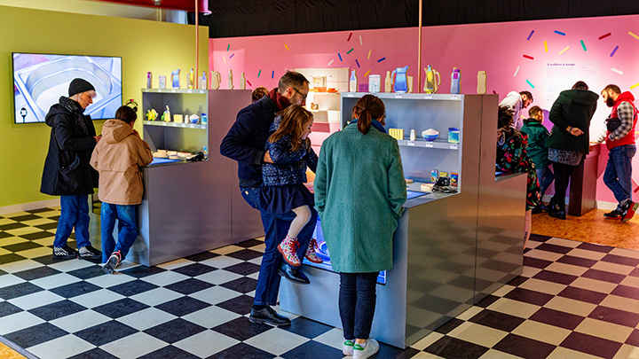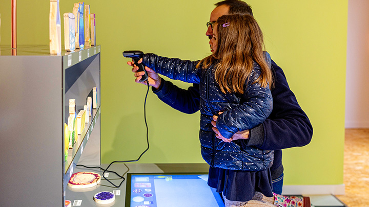 Après avoir choisi une recette, les visiteurs doivent « faire leurs courses » en scannant à l’aide de la douchette les codes-barres affichés près des objets-aliments. Une fois la liste d’ingrédients au complet, ils vont pouvoir suivre pas à pas le livre de recette et mélanger, étaler, déplacer avant de mettre au four et découvrir leurs créations culinaires.