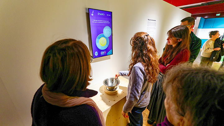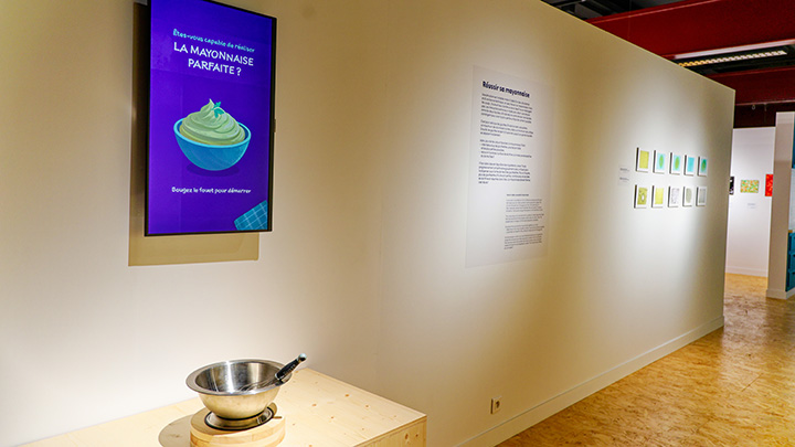 La Mayonnaise parfaite permet au visiteur de simuler la réalisation d’une mayonnaise en réalisant le geste de battre un mélange sur un véritable fouet et de découvrir à l’écran la texture du mélange évoluer ainsi qu’un zoom au niveau moléculaire pour comprendre le processus chimique de l’émulsification.