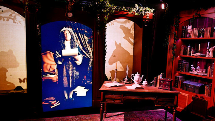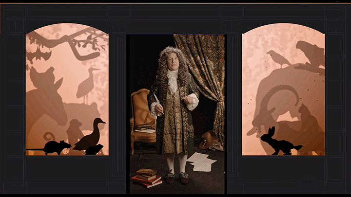 Les visiteurs sont accueillis dans le bureau de l’homme de lettres qui, à travers un dispositif mêlant rétroprojections dans lesquelles s’animent les animaux qu’il a fait vivre à travers ses fables et diffusion sur un écran d’un acteur plus vrai que le célèbre moraliste, invite à venir découvrir son œuvre et les sujets qui s’y cachent. Cette création graphique, à la fois poétique et ludique, permet d’introduire l’expérience et, déjà, de prendre conscience de l’ampleur des travaux de l’artiste.