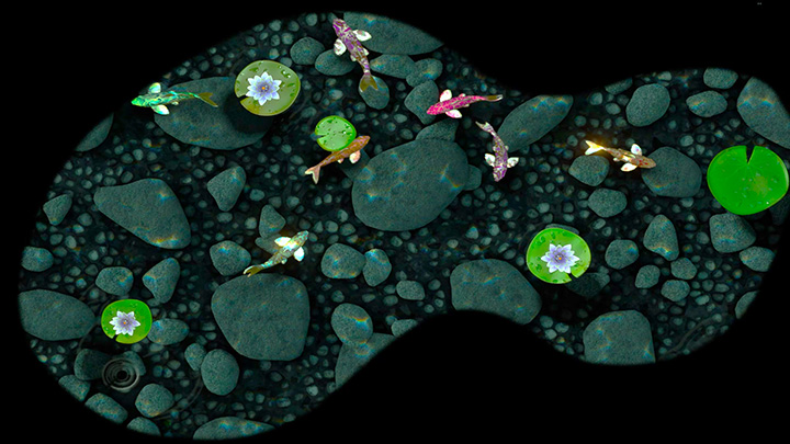 Le « Boudoire de la grenouille » abrite une scénographie féérique pleine de détails à découvrir. Pour habiller le sol de cet espace une mare interactive, dans laquelle évolue des magnifiques carpes, est projetée au sol. Les visiteurs s’amusent à s’y prélasser, à faire des encyclies ou à faire suivre les poissons…