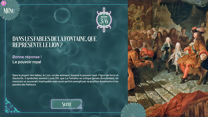 Intégré dans une scénographie aux allures d’armoire de chambre d’une «précieuse» du 17ème siècle, un quiz type QCM sur écran tactile , agrémenté de pilotage de rubans LED, permet d’en apprendre davantage sur l’époque et l’œuvre de Jean de La Fontaine.